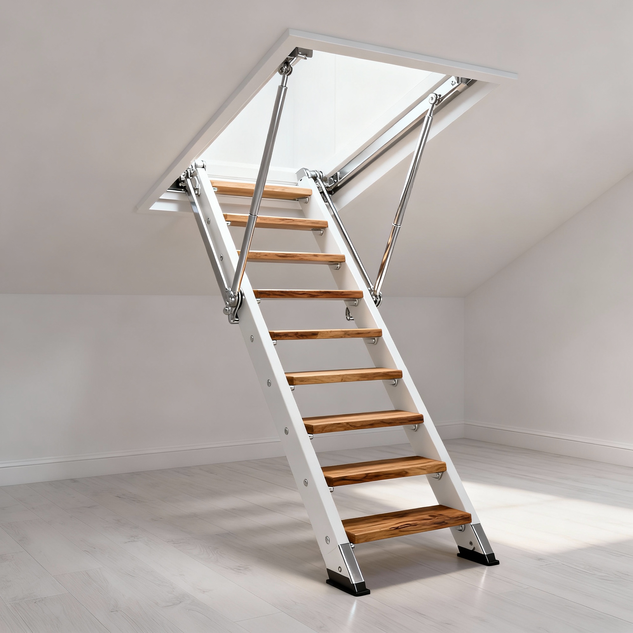 - Как это работает: При открытии люка лестница плавно разъезжается вниз, подобно гармошке. Секции надежно фиксируются в разложенном состоянии, образуя жесткий и устойчивый марш.